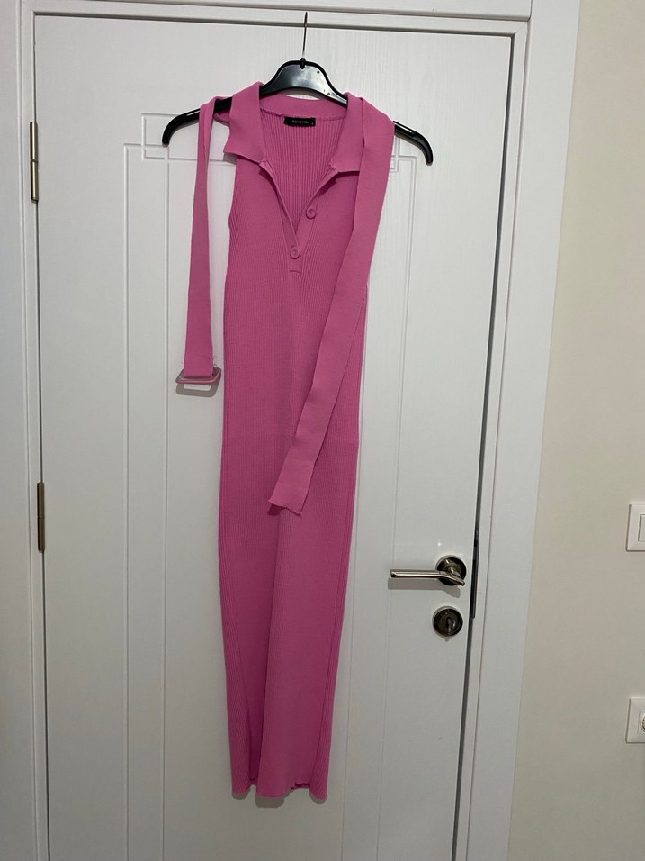 Pembe renkli uzun elbise, halter yaka ve askılı kollara sahiptir. Kemer detayı ile tamamlanmıştır ve sentetik kumaştan üretilmiştir. Günlük ve sokak stiline uygundur.