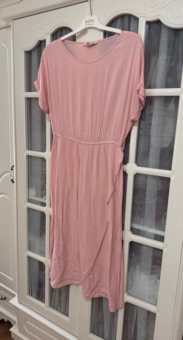 Pembe somon gibi pastel renkte, uzun ve bol kesim elbise. Kısa kollu, yuvarlak yakalı ve yumuşak keten kumaştan üretilmiştir. Hamilelikte de ve normalde de giydim pamuklu kumaş yumuşacık ve terletmiyor .
