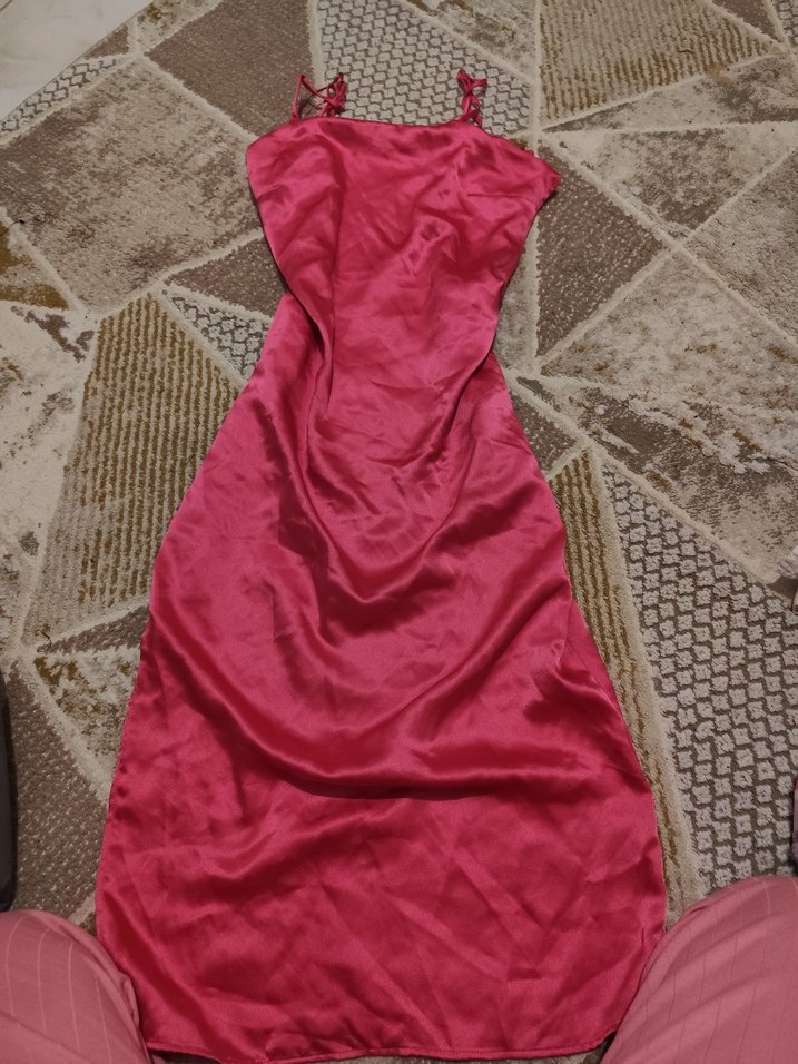 Pembe parlak kumaştan, ince ve kolsuz, uzun boylu kadın uzun elbise
