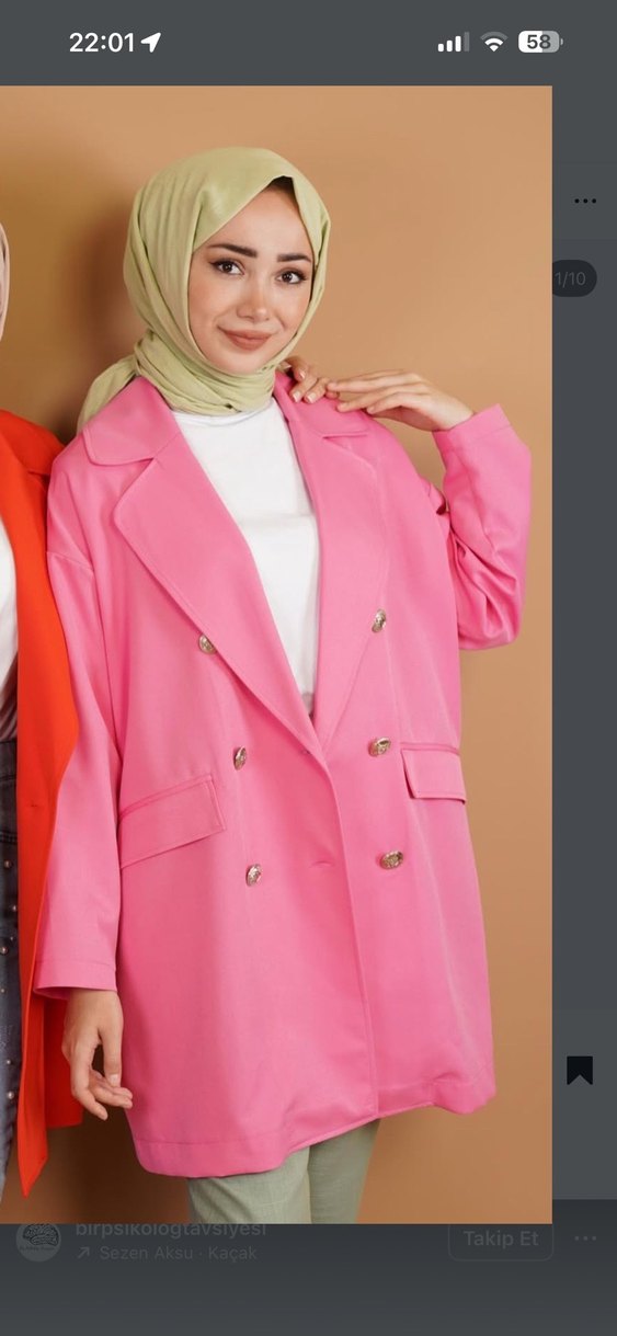 Pembe uzun blazer ceket, kesik yaka, düğmeli ön ve uzun kolludur. Rahat kesimi ve sentetik kumaşıyla günlük iş kullanımı için uygundur.