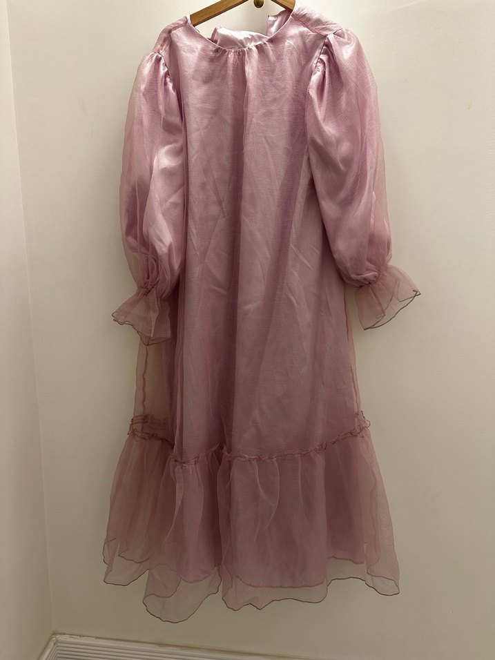 Pembe uzun elbise, bol kesim ve ruffle detaylara sahiptir. İpek gibi kumaştan, kayık yaka ve askılı kolludur. Günlük kullanım ve tüm özel günler için ideal