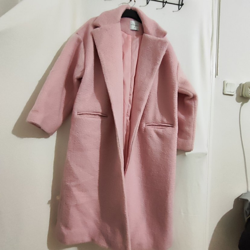 Kadınlar için uzun kesim, notched lapel yakalı, pembe pastel renkte, yumuşak ve sıcak kumaştan yapılmış, kürk detaylı kaban. Düz ve basic tasarıma sahiptir, günlük kullanıma uygundur.