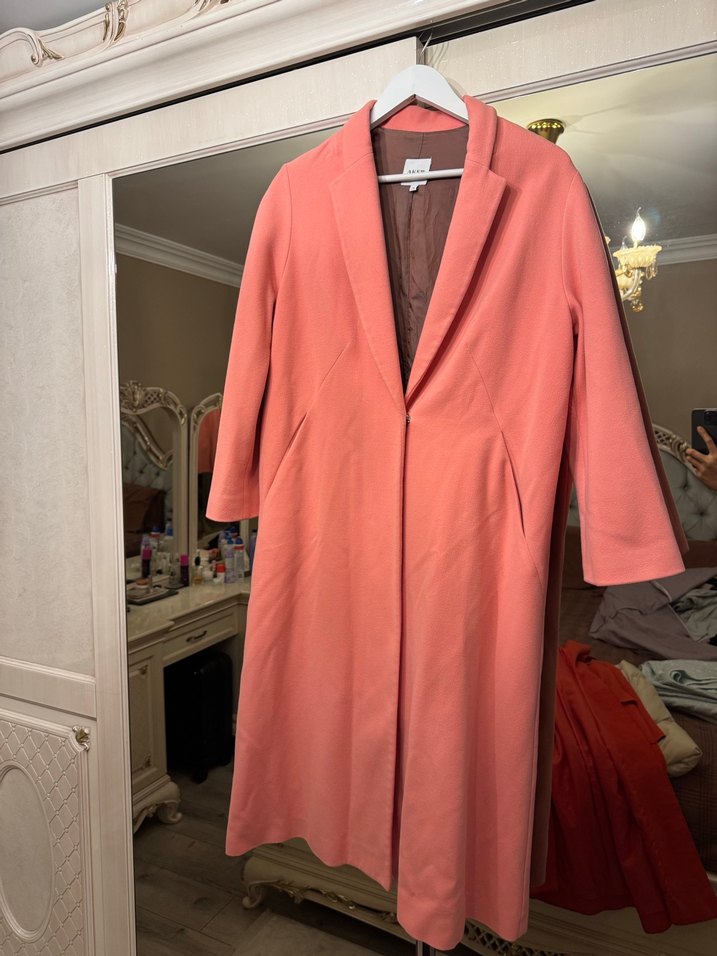 Pembe uzun kesim kadın kaban, düğmeli ve şal yaka detaylıdır. İpek gibi dokusu, klasik modern tarzıyla ofis için uygundur.
