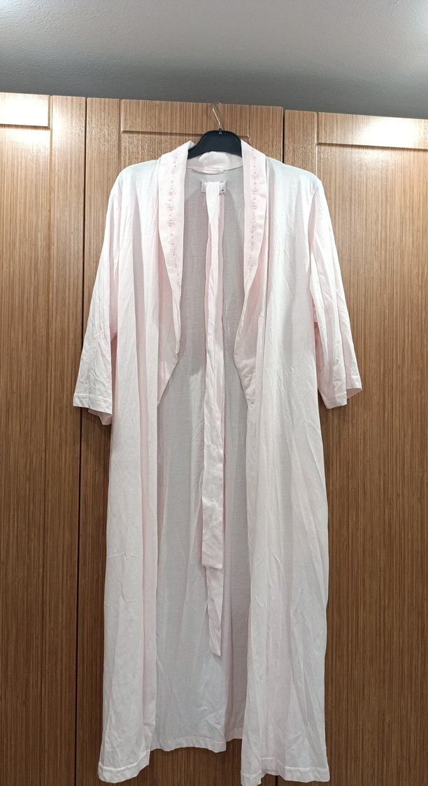pembe renkte, uzun kesim ve kısa kollu kadın sabahlık. Geniş kesimi ve yakasında işleme detaylar bulunur. defosu var, resim de çektim