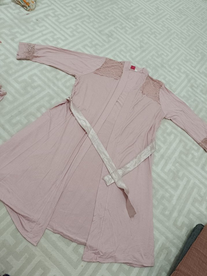 Uzun, bol kesim pembe kadın sabahlık, uzun kollu ve yumuşak pastel renkte, rahat ve bohem tarzda. Omuz ve manşetlerde dantel detayları ve kuşaklı. sıfır sabahlik