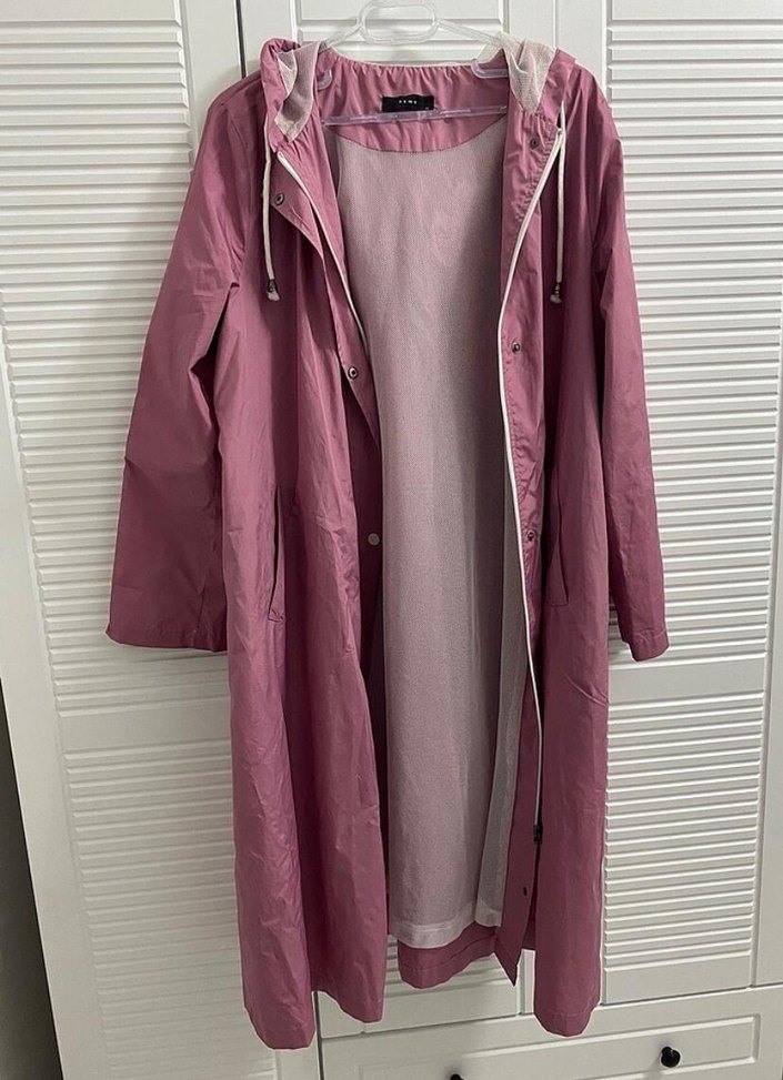 Pembe uzun yağmurluk, bol kesim ve drapeli tasarımıyla dikkat çeker. Uzun kollu ve yakası kesik detaylıdır, sentetik kumaştan yapılmıştır. ️