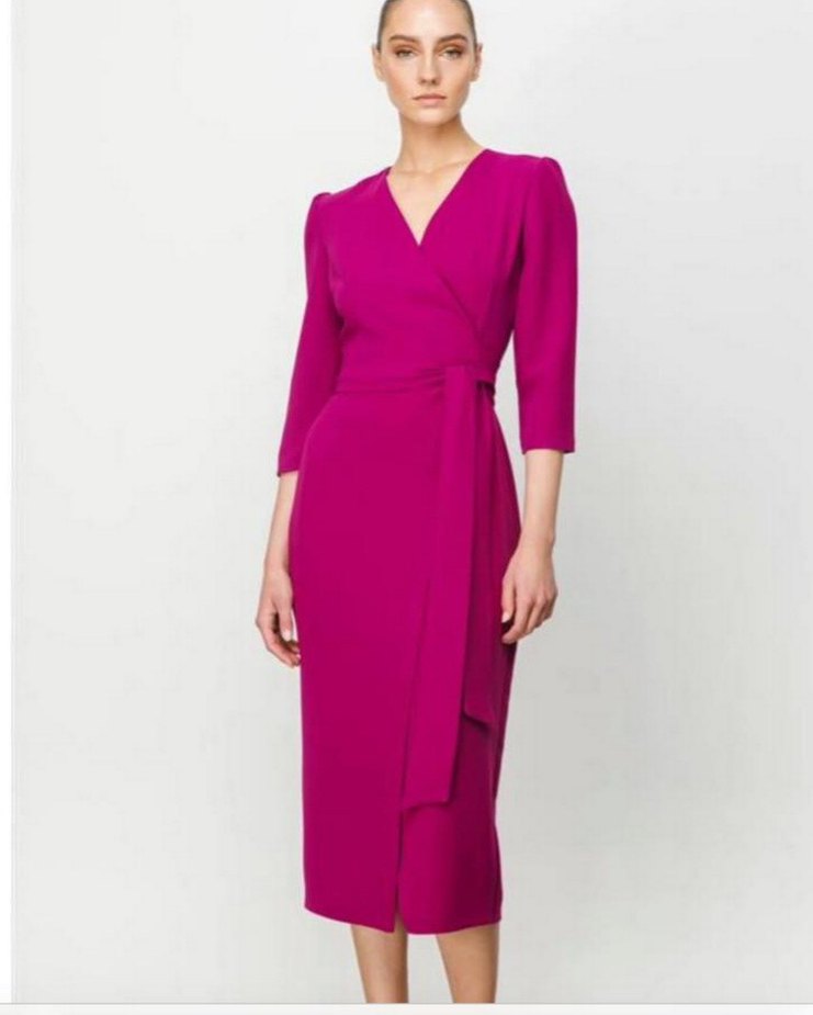 Pembe kumaştan, uzun kalem elbise. V yaka ve drapeli detaylara sahip,görünümlü, klasik ofis şıklığı için uygun.
