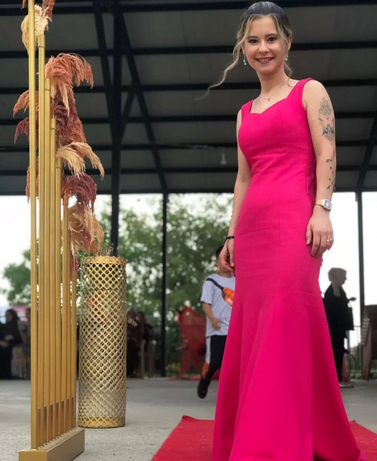 Pembe Uzun kare Yaka Drapeli Kadın Abiye