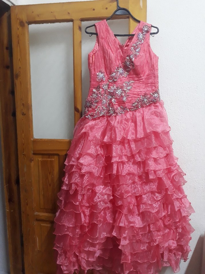 Pembe Uzun Kat Kat Abiye Elbise