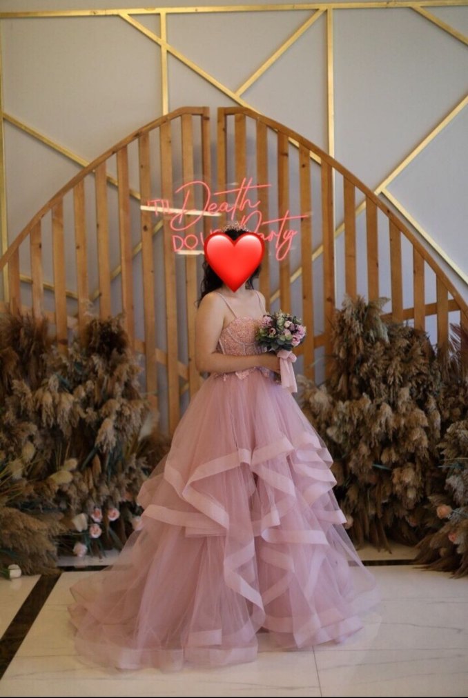 Pembe Uzun Kat Katlı Nişan Elbisesi