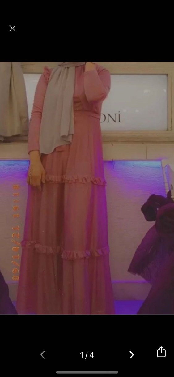 Pembe uzun elbise, yüksek yakalı ve fırfırlı detaylara sahip. Yumuşak sentetik kumaştan, bol kesimli ve kravat boyama desenli. Düğünler için bohem ve modest tarzda uygun.