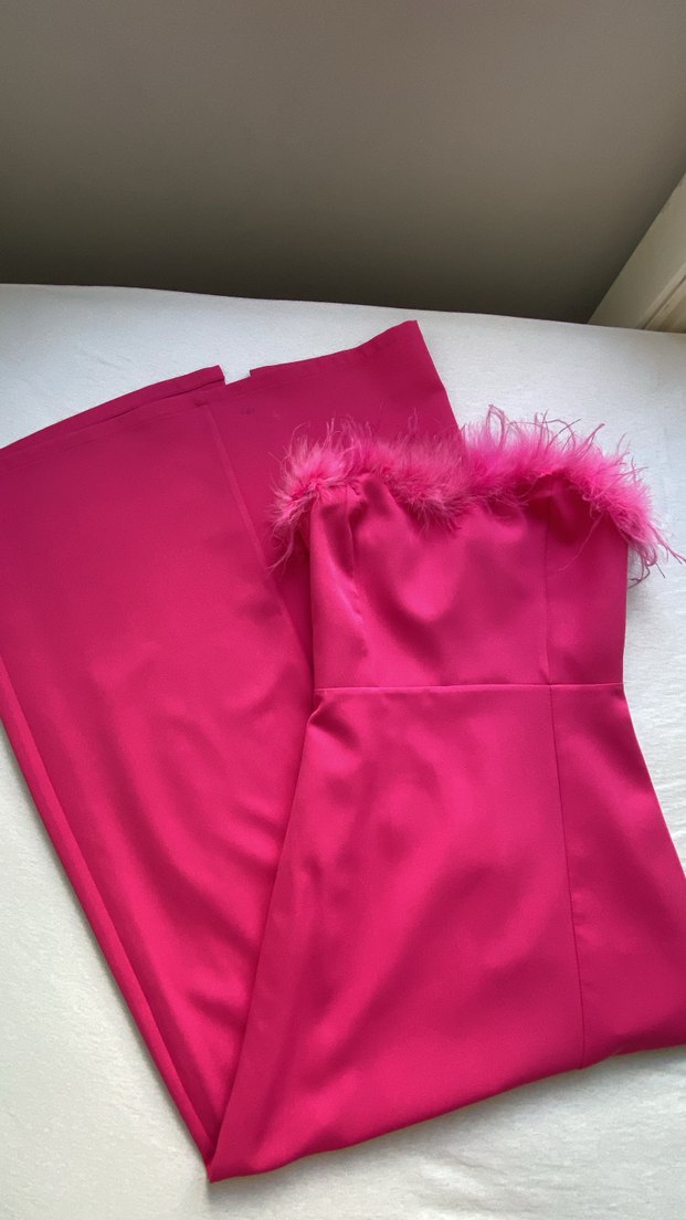 Pembe Uzun Kayık Yaka Kürklü Abiye Elbise