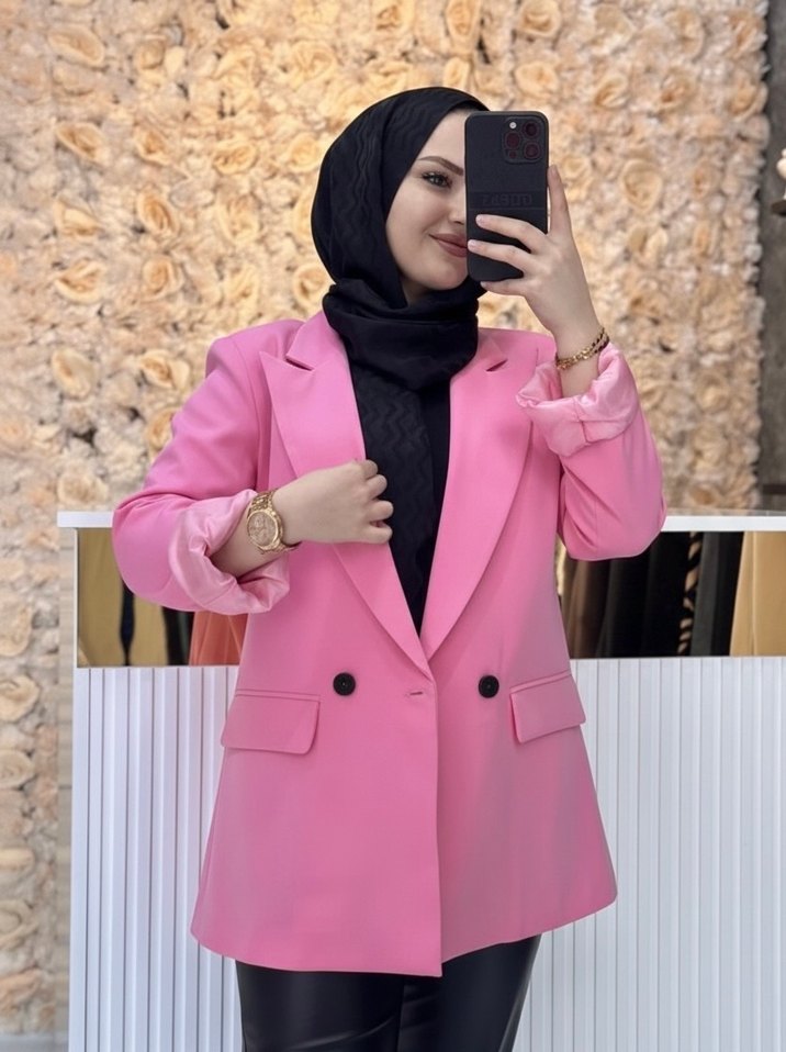 Pastel pembe renkte, uzun kesim ve düğmeli kadın blazer. İpek gibi kumaştan, uzun kollu, yakası kesik ve tie-dye desenlidir. Günlük kullanıma uygun, modest ve streetwear tarzında.