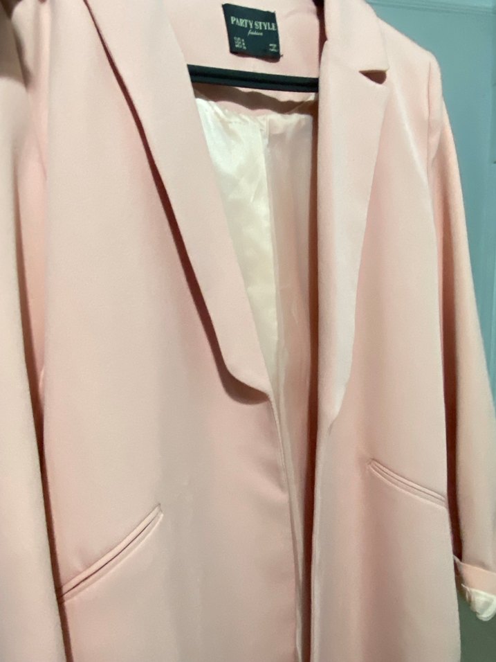 Pastel pembe renkte, düğmeli, uzun kesim kadın blazer ceket. İpek gibi kumaştan, klasik şıklık ve ofis stiline uygun, regular fit ve kesik yakalıdır. ✨