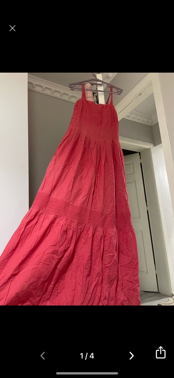 Xs yazıyor ama S bedenede olur iade yoktur Pembe renk, keten kumaştan uzun, askılı, bol kesim bohem elbise. Dökümlü detaylara ve parlak bir görünüme sahiptir, düğünler için uygundur.
