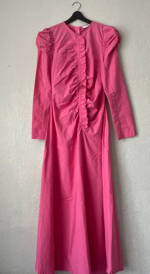 Pembe uzun keten elbise, uzun kollu ve V yakalıdır. Ön kısmında fırfır detayları bulunur. Hiç giyilmedi ve hiçbir kusuru yoktur. 40-42 beden ile uyumludur.