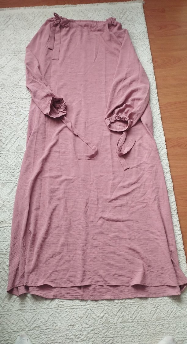 Pembe uzun keten elbise, salaş kesimli ve drapeli detaylara sahiptir. Uzun kollu, yuvarlak yaka, minimalist bohem tarzda günlük kullanım için uygundur.