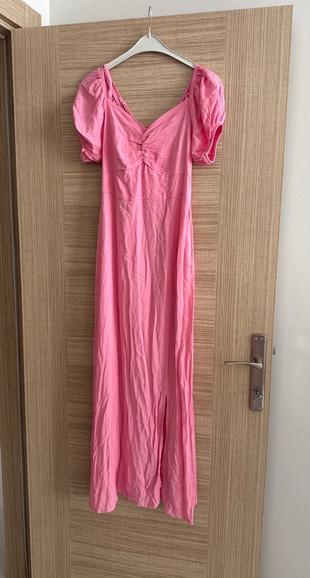Pembe uzun keten elbise, V yaka ve drapeli tasarıma sahip. İnce askılı kolları ve bohem tarzıyla romantik akşamlar için uygundur.