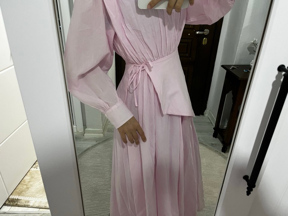 Pembe keten kumaştan, uzun kollu, V yakalı, bol kesim ve drapeli uzun elbise. Ofis için uygun, normcore Paris tarzı.