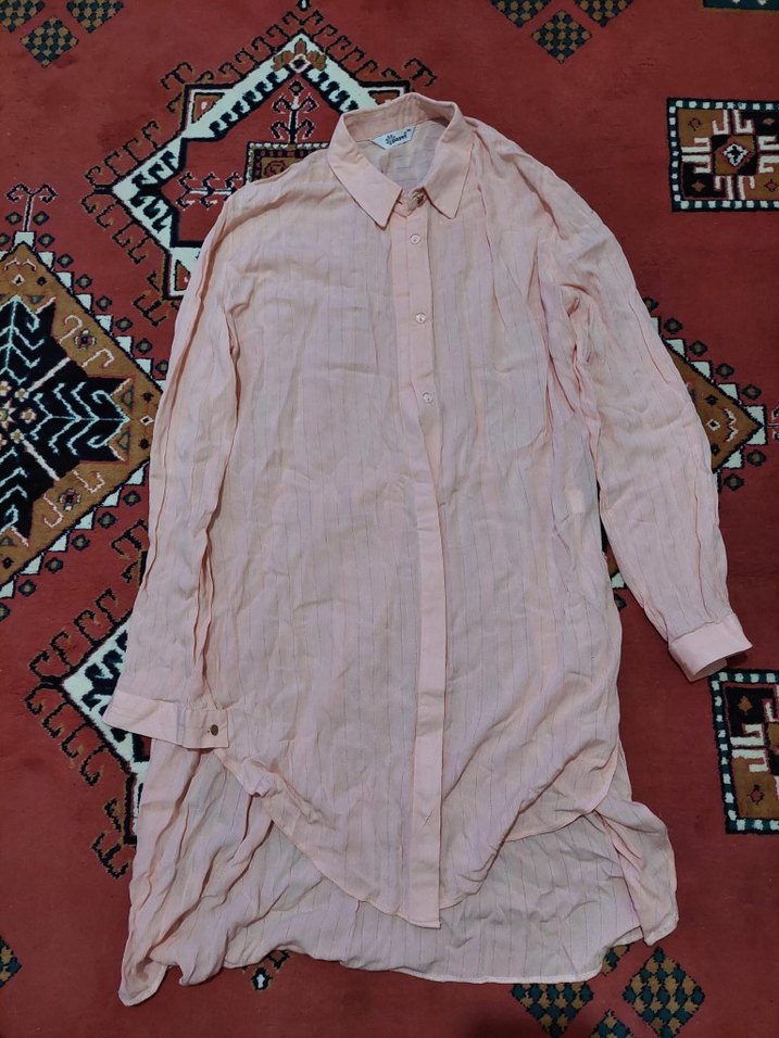 Pembe keten kumaştan, uzun kollu ve bol kesim gömlek. Yaka detaylı ve salaş tasarımıyla bohem tarzı yansıtıyor.