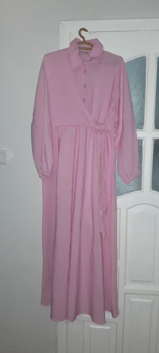 Pastel pembe renkli, keten kumaştan uzun ve salaş kesim elbise. Drapeli, uzun kollu ve yakası notched lapel tarzında, sade ve desensiz tasarım.