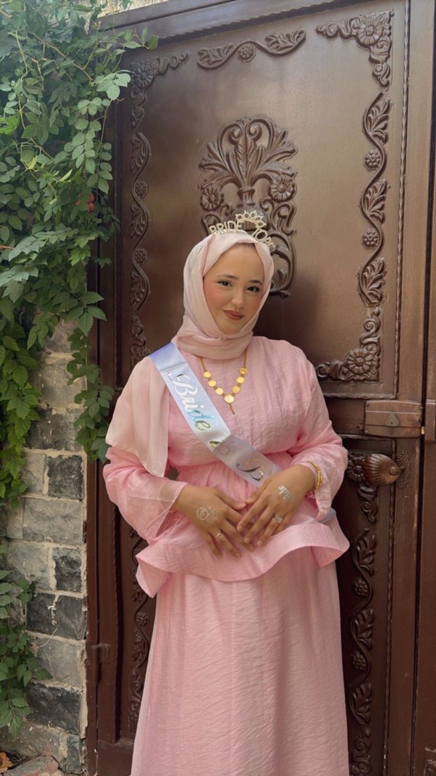 Pembe, uzun kollu, yüksek yakalı ve etnik desenli, drapeli detaylara sahip modest uzun elbise. Bohem tarzını yansıtır, düğün için uygundur.