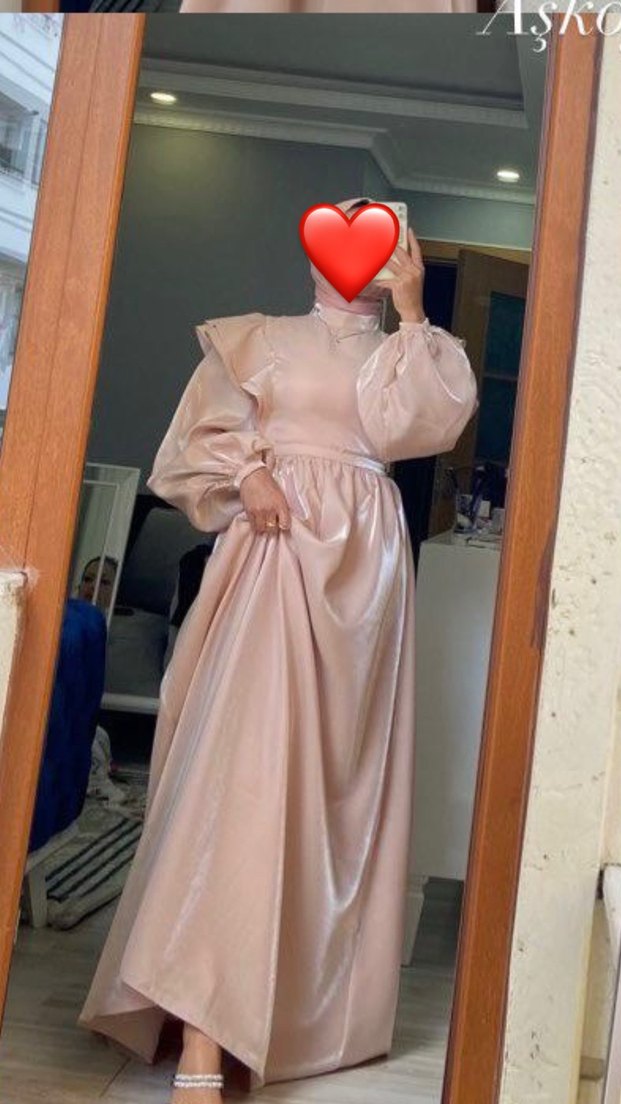 Pastel pembe renkte, yüksek yakalı ve uzun kollu, bol kesim uzun elbise. İpek dokulu kumaştan, drapeli detaylara sahip, mütevazı ve düğünlere uygun tarzda.Markası Manuka