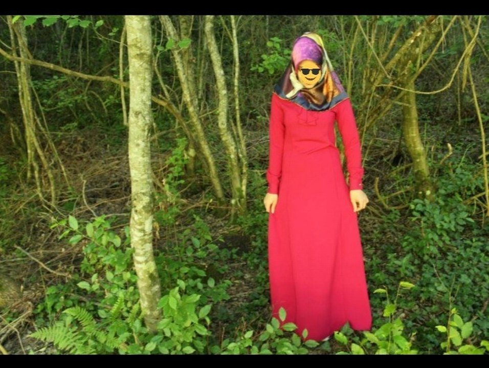 Canlı pembe renkte, yüksek yakalı ve uzun kollu, drapeli tasarıma sahip, sentetik kumaştan yapılmış, bohem tarzda, sade uzun elbise.
