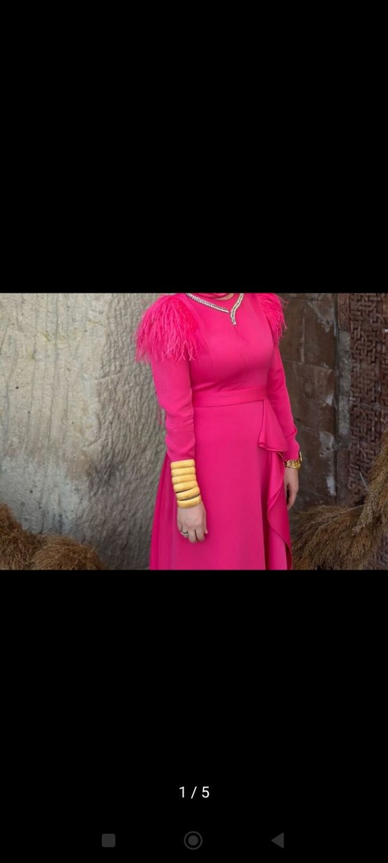 Senna Designn markalı, sadece bir kez giyinilmiş. üzerindeki şal da hediyemdir.Yüksek yakalı, uzun kollu ve omuzları kürklü, epembe uzun kolye elbise, parti için uygun şık bir tasarımdır.