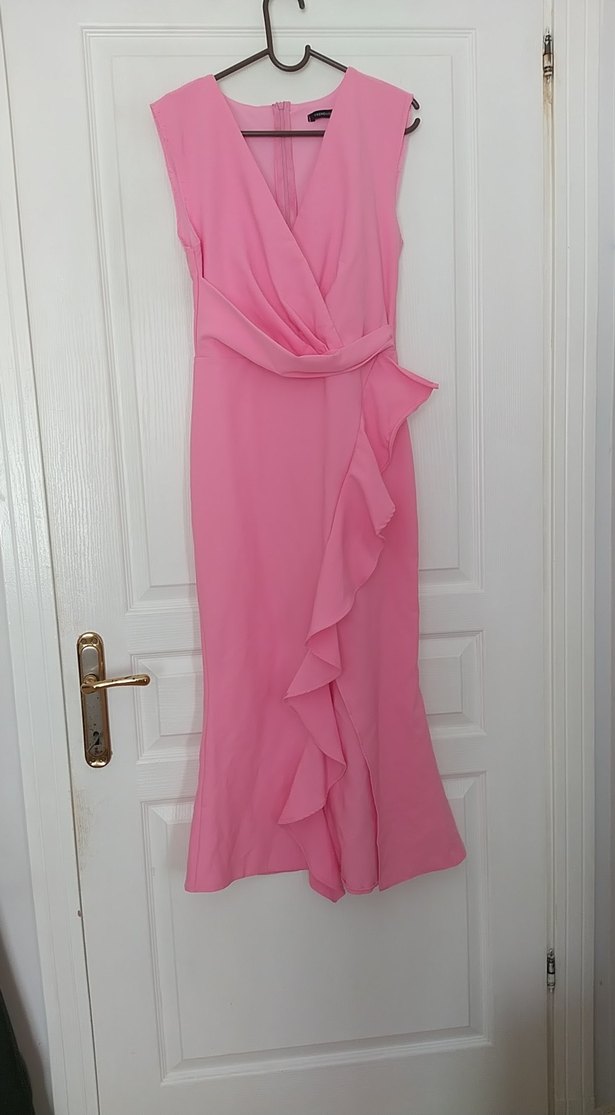 Pembe renkte, kolsuz ve V yakalı uzun elbise, önden fırfır detayına sahiptir. Düzenli kesimiyle klasik ve çağdaş Paris tarzını yansıtan düğünler için uygundur. Daha önce hiç giyilmedi sadece kol kısmının tamir edilmesi gerekiyor