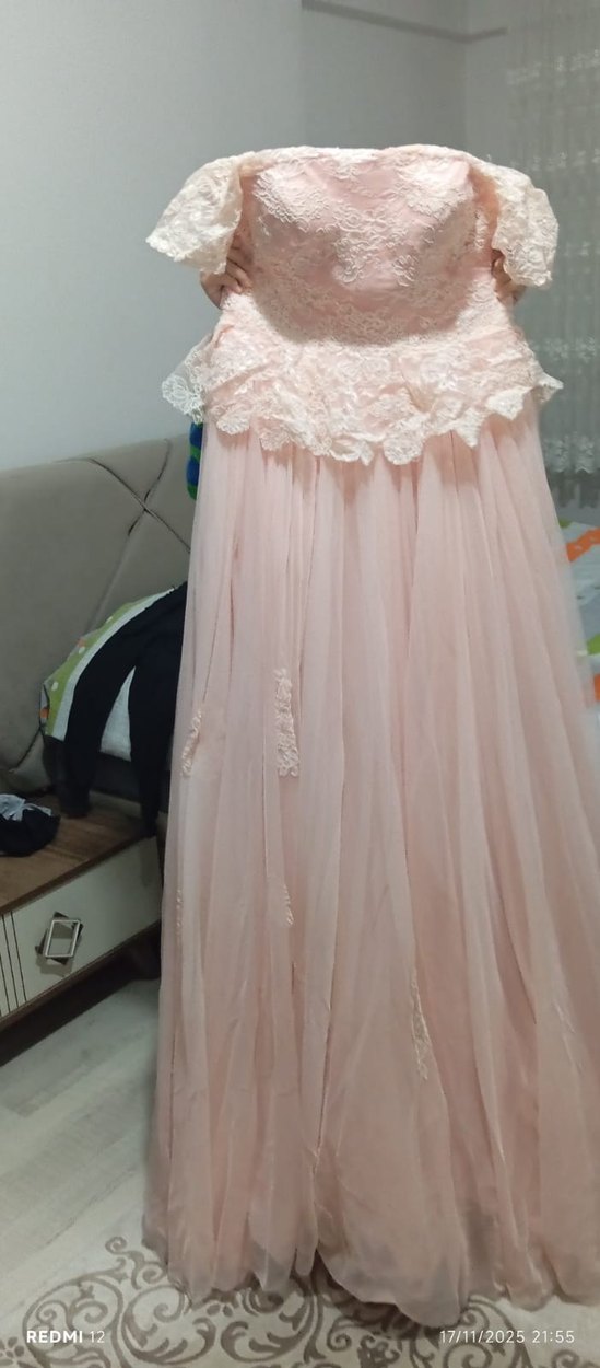 Uzun, pastel pembe renkte, straplez ve kolsuz, bol kesim gelinlik. Dantel volan detaylarıyla klasik şıklık sunar.