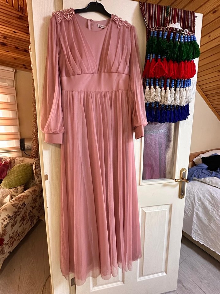 tesettür Pembe abiye , uzun kollu ve drapeli bu uzun abiye elbise, V yaka ve bol kesimiyle modern klasik tarzı yansıtır. Düğün için uygundur . sadece bir kez giyildi.