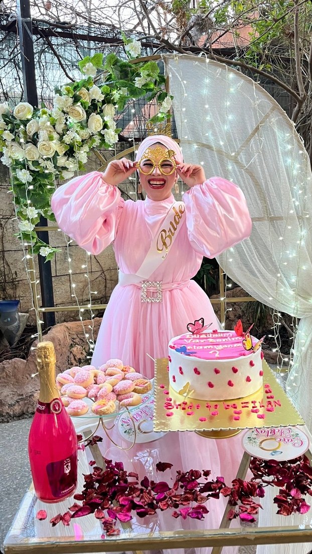 Bol kesim, uzun pembe elbise, balon kollu ve yüksek yakalı, baskılı deseniyle göz alıcı parti kıyafeti. Arkası fermuarlı beli lastiklidir.