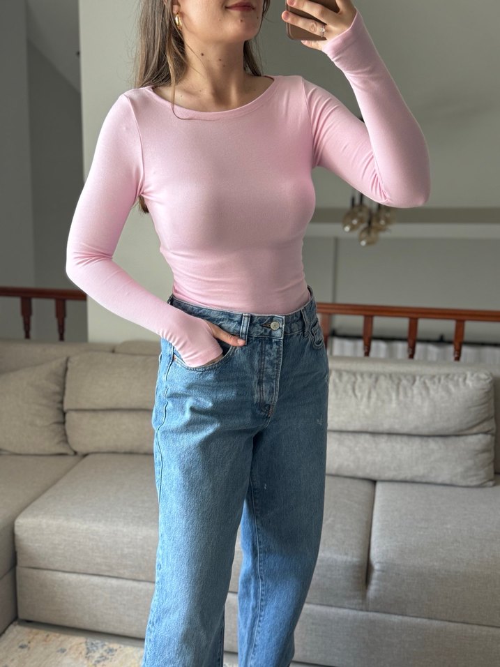 Pembe pastel tonlarında, uzun kollu ve bisiklet yaka, vücuda oturan denim kumaştan yapılmış kadın bluzudur. Günlük rahat kullanıma uygundur.