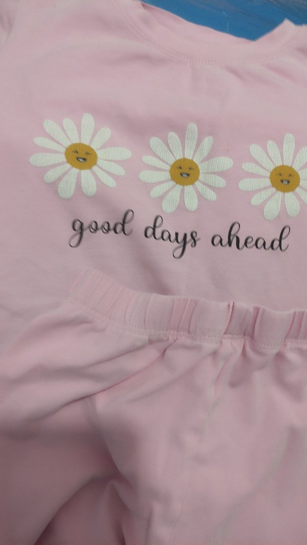 Pastel pembe renkli, uzun kollu bebek kıyafet takımı. Üzerinde gülen üç çiçek ve "good days ahead" yazısı bulunur.