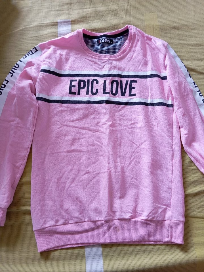 Pembe, uzun kollu, yuvarlak yaka ve lastikli manşetlere sahip bol kesim sweatshirt. "EPIC LOVE" baskılı renkli tasarımla günlük sokak stili için uygun.