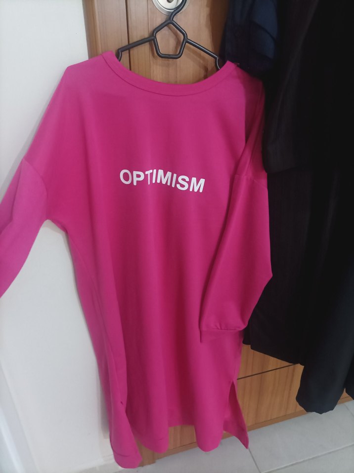 Renkli "OPTIMISM" baskılı, uzun kollu, normal boy midi pembe sweatshirt elbise. Salaş kesim ve yırtmaç detayı bulunur.