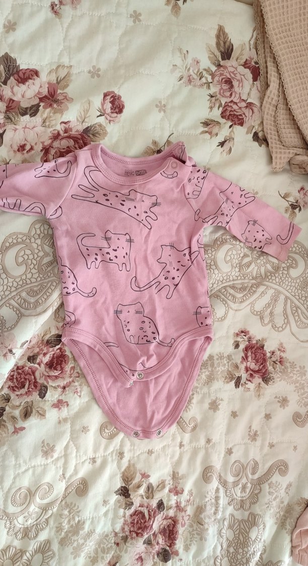Pembe renkli, uzun kollu, yuvarlak yakalı bebek body.pastel tonlarda, kedili sade desenli. Yumuşak ve rahat kumaşlı.