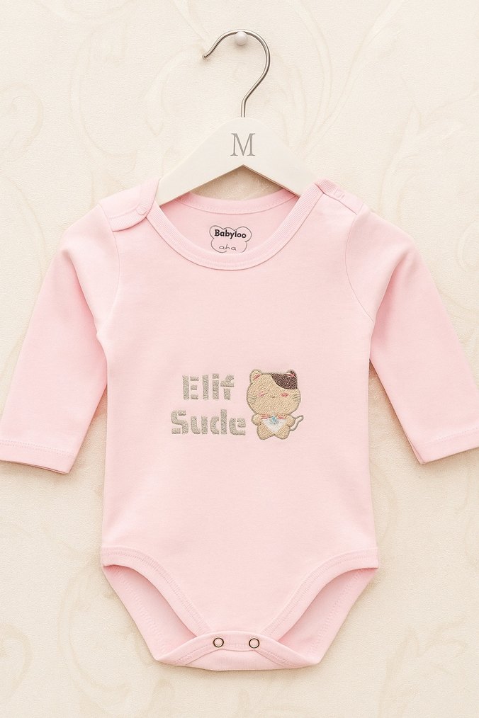 Pastel pembe renkli, uzun kollu bebek body. Kişiye özel isim nakışlıdır. Farklı figürler ve yazı fontu seçenekleri ile istediğiniz beden için sipariş oluşturabilirsiniz.