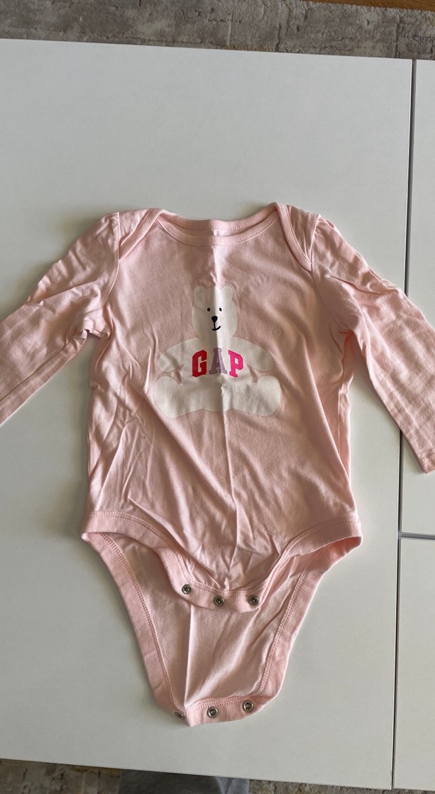 Pastel pembe renkte, uzun kollu, yuvarlak yaka ve düğmeli bebek body. Üzerinde ayı ve GAP baskısı bulunur.