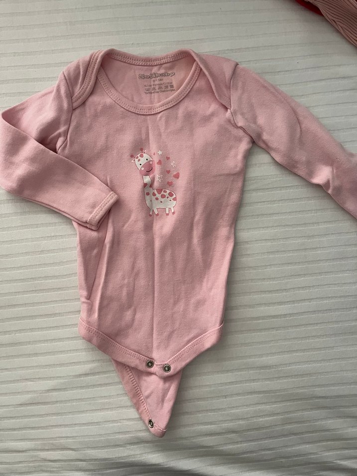 Pembe uzun kollu, yuvarlak yakalı bebek body. Önde çıtçıtlı ve sevimli zürafa baskılı. Pastel tonlarda.