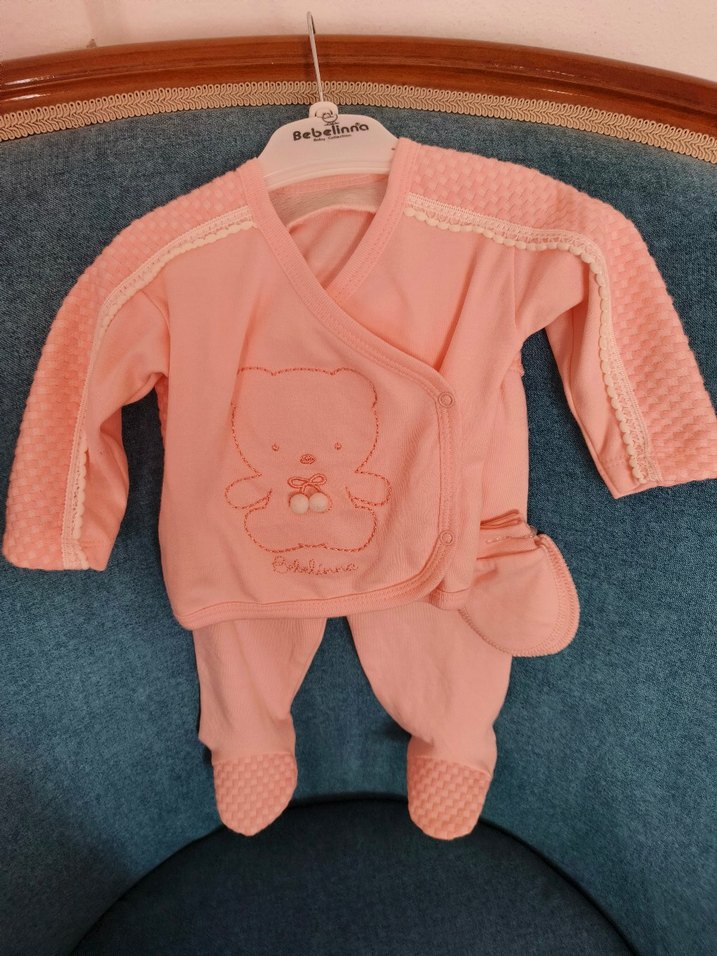Pastel pembe renkte, uzun kollu, düğmeli ve işlemeli detaylara sahip bebek kıyafet takımıdır. Takım, pantolon eldiven şapka önlük içerir.