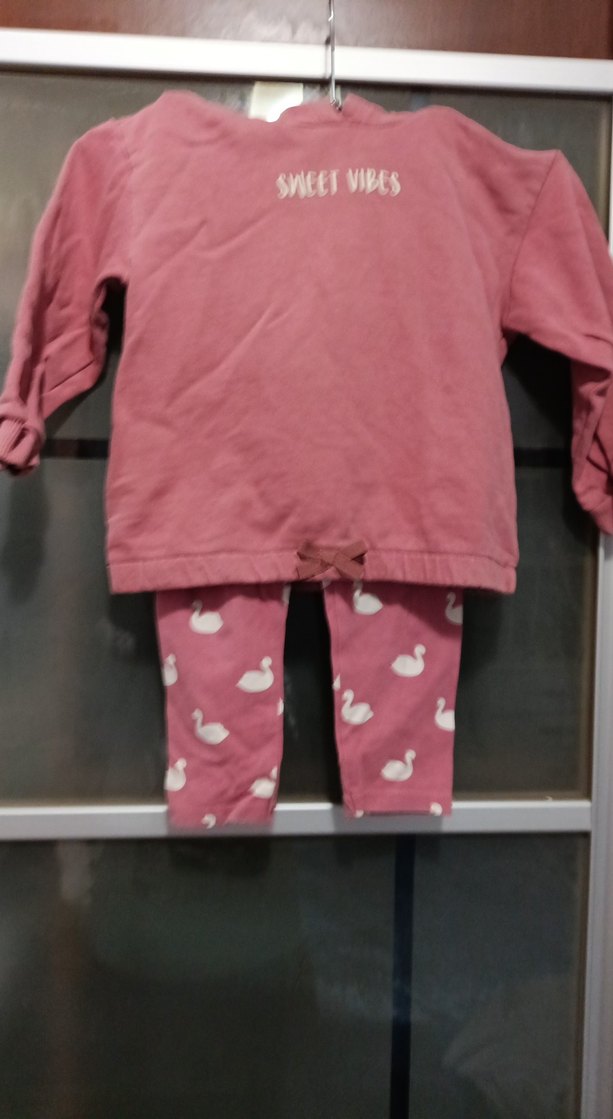 Uzun kollu pembe üstü "SWEET VIBES" yazılı, beyaz kuğu desenli pembe taytla takım. Örgü ve yumuşak dokulu.
