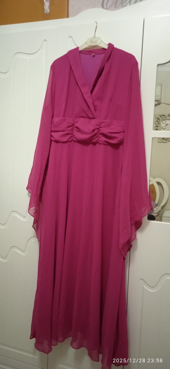 Pembe renkli, V yakalı, uzun kollu ve bol kesim bohem tarzda vintage kadın abiye elbise. Drapeli detaylara sahip, düğünler için uygun.