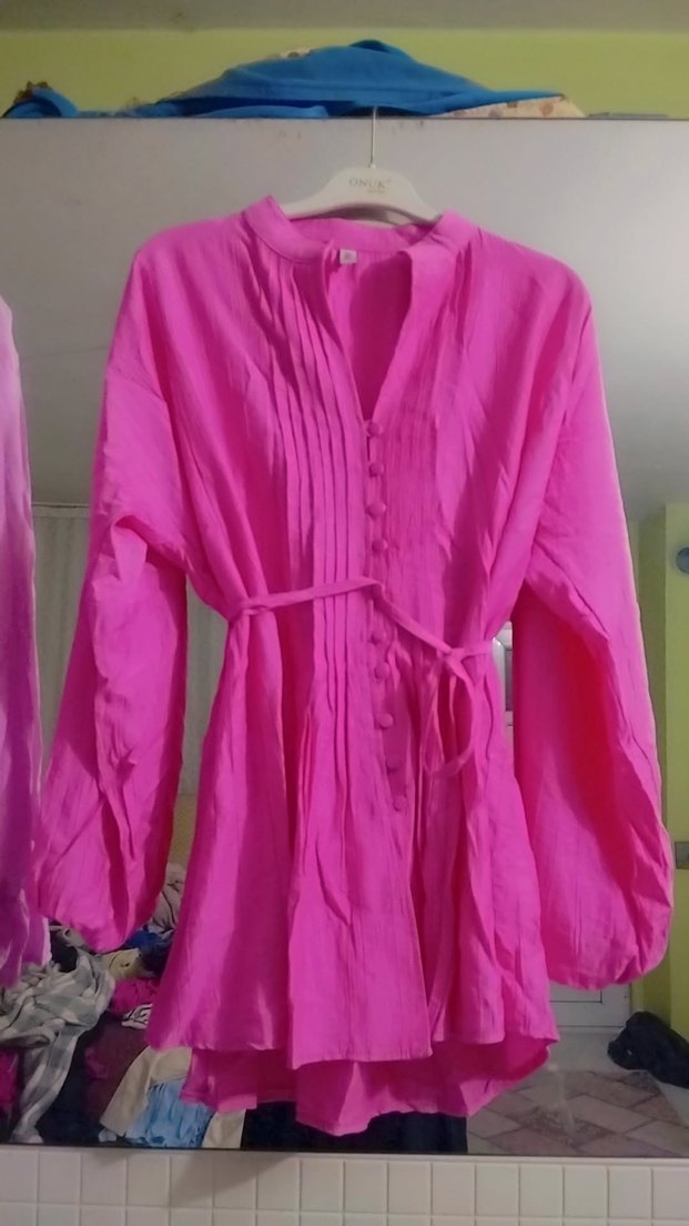 Pembe keten kumaştan, uzun kollu, V yakalı, düğmeli ve belden bağlamalı bol kesim bohem gömlek. Günlük kullanım için uygundur.