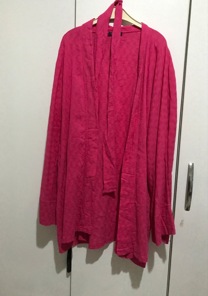 Bu kadın sabahlık, bol kesim ve uzun boydadır. Uzun kollu, parlak pembe renkte, desensiz ve bohem Paris tarzındadır. Kimano az giyildi sorunu yok