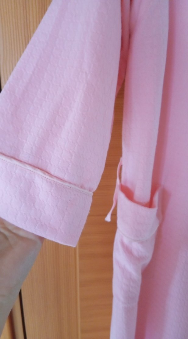 Pastel pembe renkte, uzun boylu, bol kesim ve uzun kollu, desensiz bohem tarzda kadın sabahlık. Ön cep detayına sahiptir.