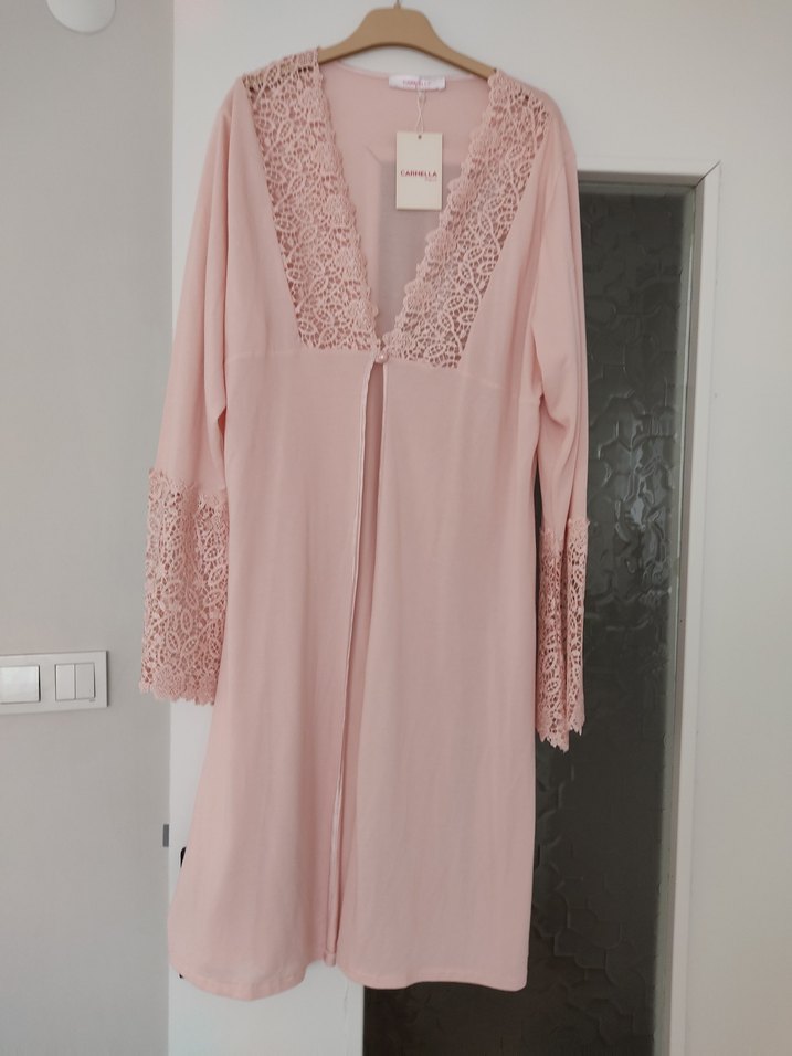 Pembe uzun kollu, bol kesim kadın sabahlığı, yakada ve kollarında zarif dantel detaylara sahip, rahat bohem tarzında.