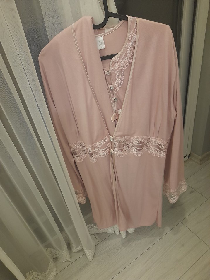 Bohem tarzda, uzun kollu, bol kesim pembe pastel kadın sabahlık. Dantel detayları ve uzun boy tasarımı ile sade ve şık.cok şık iç kısa kollu alt pijama var dıs gıyımde sabahlık cok malı kalıtelı mükemmel m beden 3 parca aldım alt pıjaması uzun geldı dıye terzıyede yaptırdım bılek de uzun sevmediğim için ama acma payı var hıc kukanmadım doguma hazırlık yaptım hastane için ama gıyılmedı fırsat olmadı simdi de olmuyo pahalı magzadan alındı pamuklu kumas tiril tiril kuması