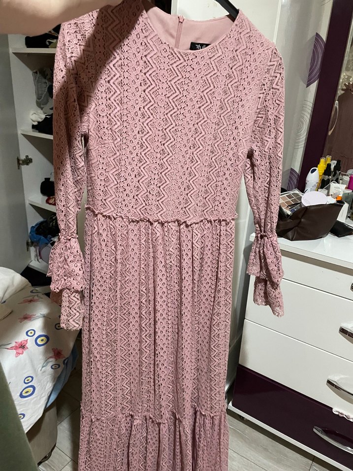 Pembe Uzun Kollu Bohem Örgü Elbise Tesettür